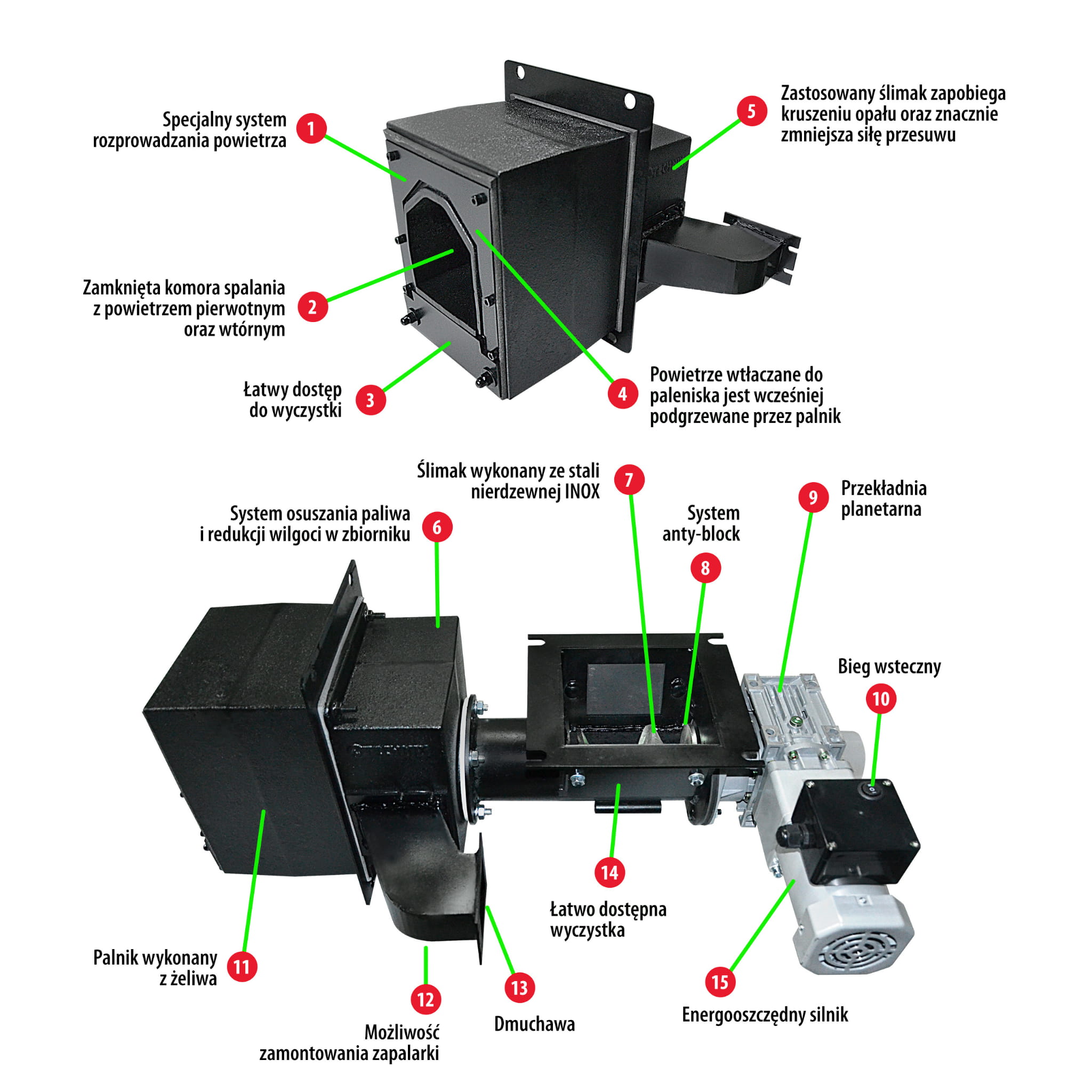Charakterystyka palnika SV200 Technix: ✅ podajnik Technix w żeliwnej obudowie z żeliwnym stałym paleniskiem ✅ wyposażony w stalowy ślimak, motoreduktor z przekładnią ✅ dysze napowietrzające - lepsze dopalanie opału ✅ bieg wsteczny lewe obroty silnika ✅ ślimak stalowy z przeciw-zwojem nie obciąża przekładni ✅ dolna wyczystka ✅ automatyczna zapalarka do pelletu |