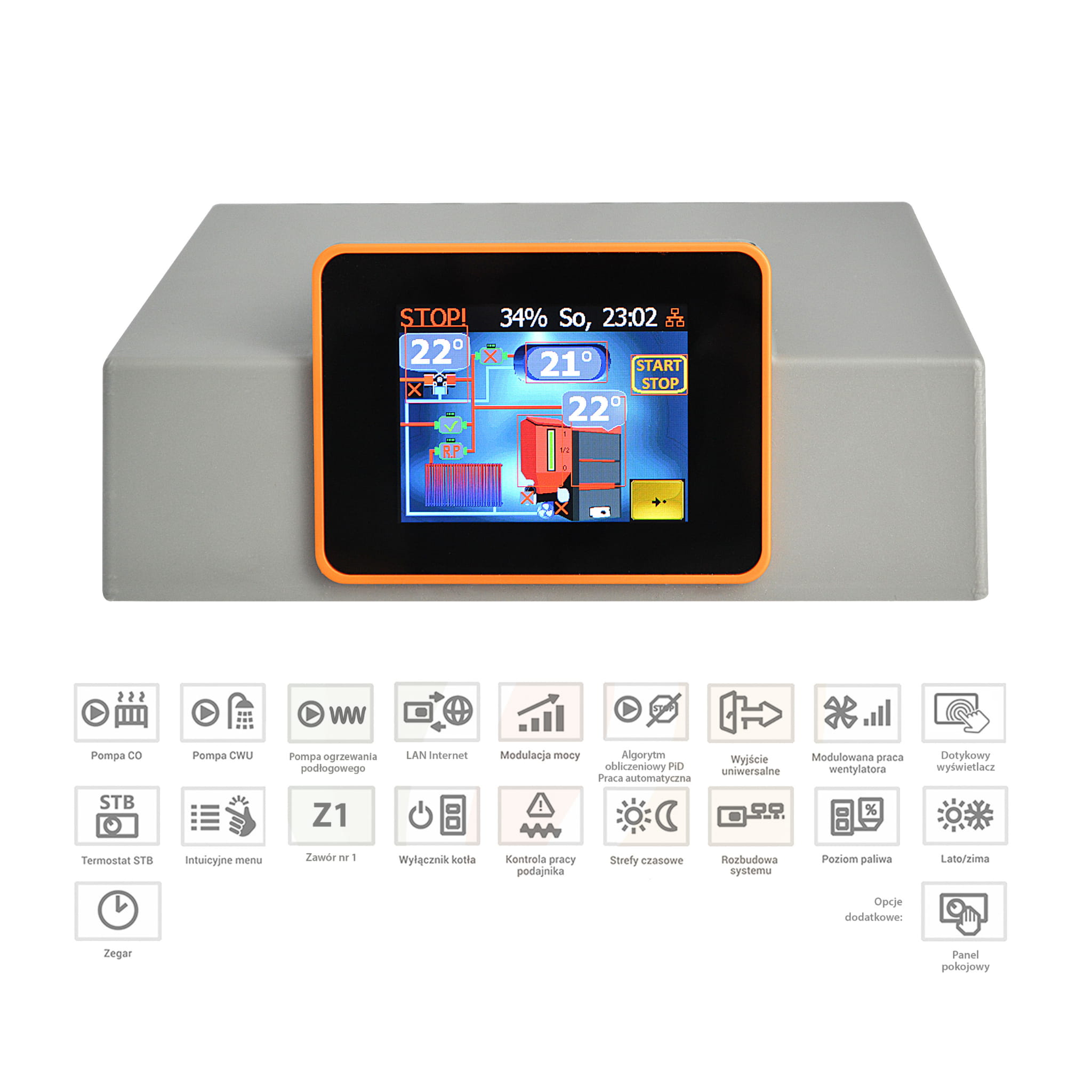 Sterownik Argos PID PELLET PLUS (ODPŁATNIE): ✅ kolorowy ekran dotykowy ✅ obsługa do 3 pomp CO, CWU, podłogówka ✅ obsługa siłownika mieszacza - zaworu mieszającego ✅ obsługa podajnika ślimakowego ✅ wbudowany moduł internetowy LAN RJ-45 ✅ licznik spalania paliwa ✅ wskaźnik ilości pozostałego paliwa w koszu ✅ strefy czasowe W podstawowym automatycznym trybie użytkownik wybiera zakres mocy z jaką może pracować palnik oraz ilość powietrza dla punktu min-max. Na tej podstawie algorytm będzie starał sie prowadzić proces spalania z możliwie najlepsza skutecznością i bez zbędnych skoków temp. Kolorowy, szklany, dotykowy ekran TFT 320x240 pikseli o przekątnej 3,2cala z przejrzystym menu i czytelną czcionką ułatwiają obsługę. Wbudowany moduł internetowy, po podłączeniu do przewodowej sieci LAN wtykiem RJ45 (skrętka komputerowa) umożliwia zdalny dostęp do sterownika za pośrednictwem przeglądarki i dedykowanej platformy po wykupieniu abonamentu (wykresy pracy, powiadomienia, zdalna zmiana nastaw) |